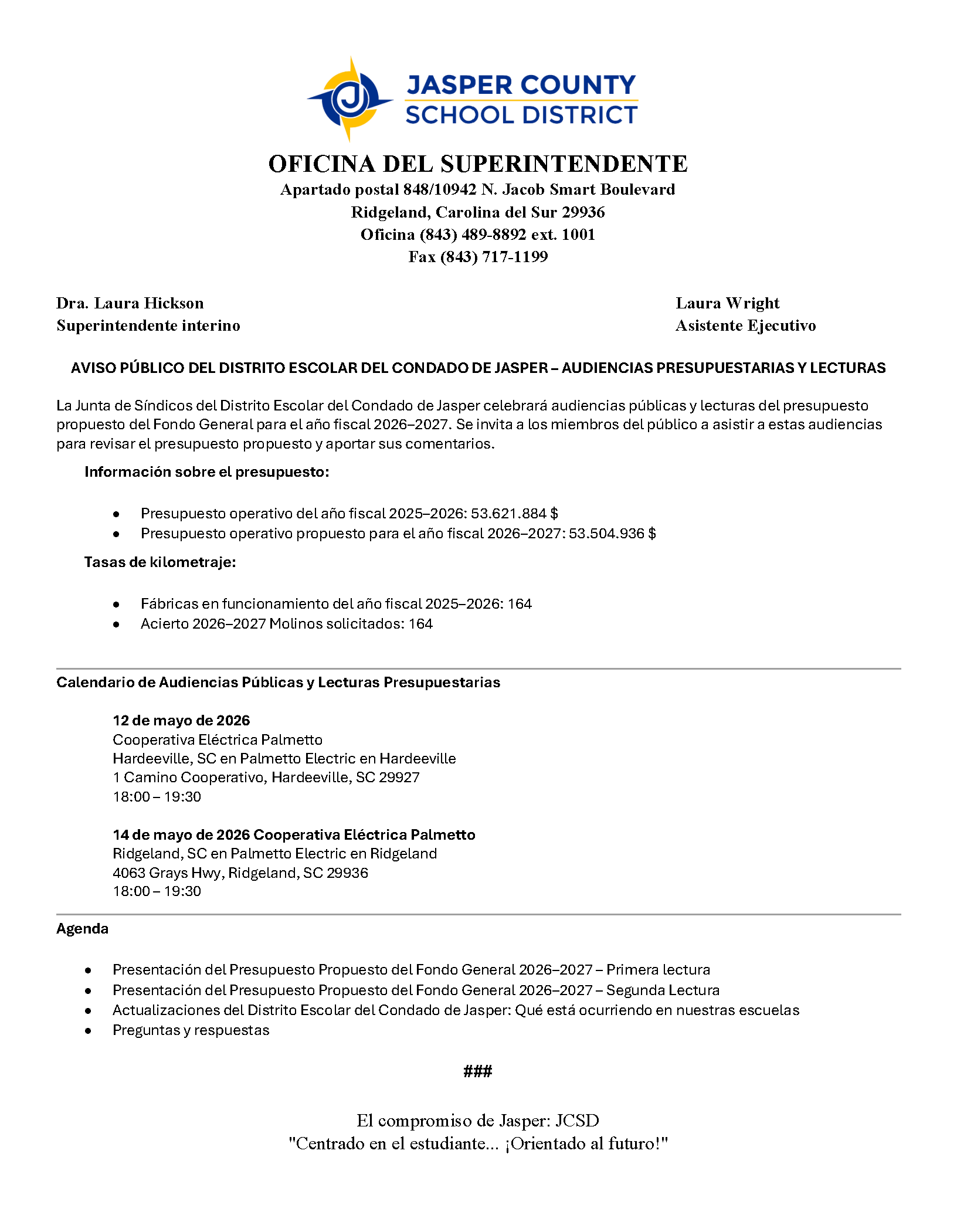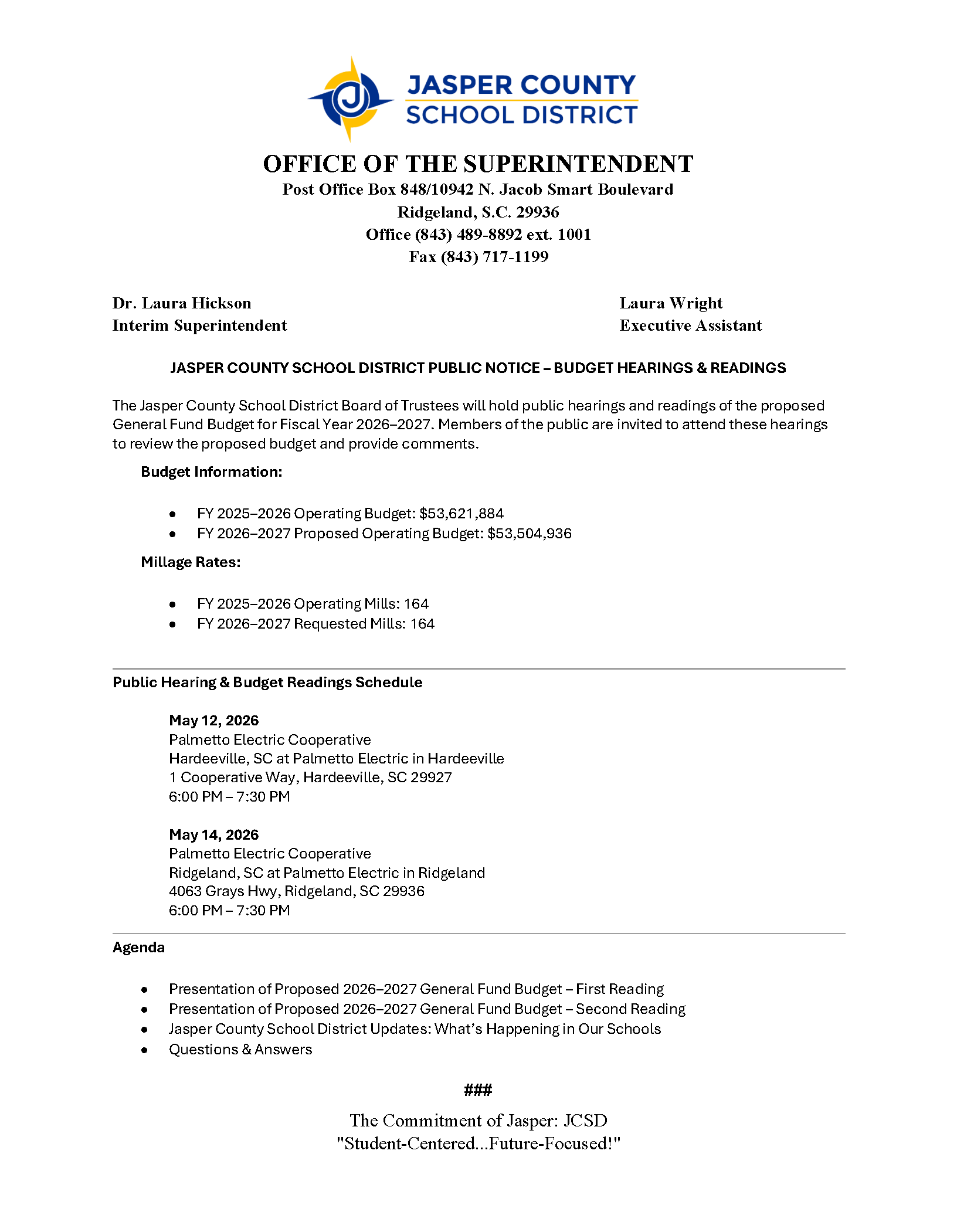 JASPER COUNTY SCHOOL DISTRICT PUBLIC NOTICE – BUDGET HEARINGS & READINGS
